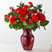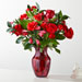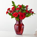 Amplified by a ruby red vase, this rich arrangement of roses, carnations, and Alstroemeria is like playing them a love song. Please Note: The bouquet pictured reflects our original design for this product. While we always try to follow the color palette, we may replace stems to deliver the freshest bouquet possible, and we may sometimes need to use a different vase.