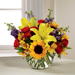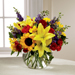 Your recipient always takes care of everyone else - they are thoughtful, they are kind, and they are completely deserving of a special surprise consisting of bright, beautiful blooms. Sunlit yellow Asiatic Lilies, sunflowers, red carnations, red spray roses, yellow Peruvian Lilies, purple larkspur, and ivy vines are expertly arranged in a clear glass bubble bowl vase to express your appreciation in floral style. A wonderful birthday, thank you, or thinking of you gift! GOOD bouquet includes 13 stems. Approx. 11"H x 10"W. BETTER bouquet includes 17 stems. Approx. 12"H x 11"W. BEST bouquet includes 21 stems. Approx. 15"H x 14"W.