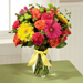 Celebrating life with colorful blooms that inspire and delight, this flower bouquet is ready to create a happy moment for your recipient that they will never forget. Orange roses, hot pink gerbera daisies, yellow gerbera daisies, hot pink carnations, green button poms, bupleurum, and lush greens mingle together to create a sunlit display while seated in a classic clear glass vase tied at the neck with a yellow satin ribbon for a sweet affect. A perfect get well, happy birthday, or congratulations gift! GOOD bouquet includes 12 stems. Approx. 14"H x 11"W. BETTER bouquet includes 16 stems. Approx. 15"H x 12"W. BEST bouquet includes 20 stems. Approx. 16"H x 12"W.