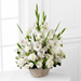 The FTD® Eternal Affection™ Arrangement is a peaceful offering of heartfelt sympathy. White gladiolus, Peruvian lilies, carnations, mini carnations and lush greens are beautifully arranged in a round whitewash handled basket to create a beautiful display of soft serenity.