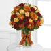 The FTD® Golden Autumn™ Bouquet exudes the warmth and comfort of the harvest season with each colorful bloom. Peach spray roses, burgundy mini carnations, butterscotch chrysanthemums and lush greens are arranged beautifully in a classic clear glass vase accented with an orange plaid ribbon around the neck, creating a truly wonderful bouquet that will send your sweetest sentiments to your special recipient for a fantastic fall.