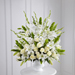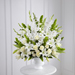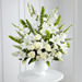 The FTD® Morning Stars™ Arrangement is a brilliant expression of peace and soft serenity. White roses, carnations, gladiolus, stock, and Oriental lilies are accented with the bright green stems of Bells of Ireland and a gorgeous assortment of lush greens, while seated in a white designer plastic urn to create a beautiful way to honor the life of the deceased.