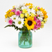 With its sunny hues and fun floral variety, this bouquet will light up the face of whoever you give it to. Through a bright combination of sunflowers, daisy pompons, and spray roses set in a ribbed aqua glass vase, our FTD florists have designed a bouquet that brighten up every moment. GOOD bouquet is approx. 11”H x 11”W. BETTER bouquet is approx. 12”H x 12”W. BEST bouquet is approx. 13”H x 13”W.