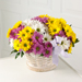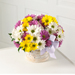 Imagine a warm, sunny day intense with color. We've gathered those colors together - deep lavender daisy pompons, sunny yellow daisy pompons and bright white daisy pompons - into a round white-wash basket trimmed with a light lavender bow. Perfect to celebrate any occasion.