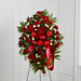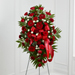 The FTD® Treasured Memories™ Standing Spray is a rich and colorful way to express your unending love and devotion to the departed. An exceptional arrangement of red roses, burgundy carnations, burgundy mini carnations, red gerbera daisies and white button poms are accented with a variety of lush greens. A red ribbon with the word, "Beloved," embossed in a gold metallic lettering, finishes this beautiful display for their final farewell service. Displayed on a wire easel.