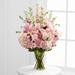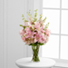 The FTD® Wishes & Blessings™ Bouquet is a stunning way to offer your condolences for their loss and commemorate the life of the deceased. Soft pink roses, spray roses, Oriental lilies, hydrangea and larkspur are brought together in a clear glass vase to create an eye-catching display of soft serenity.